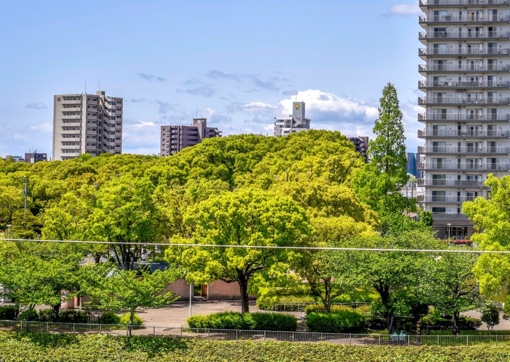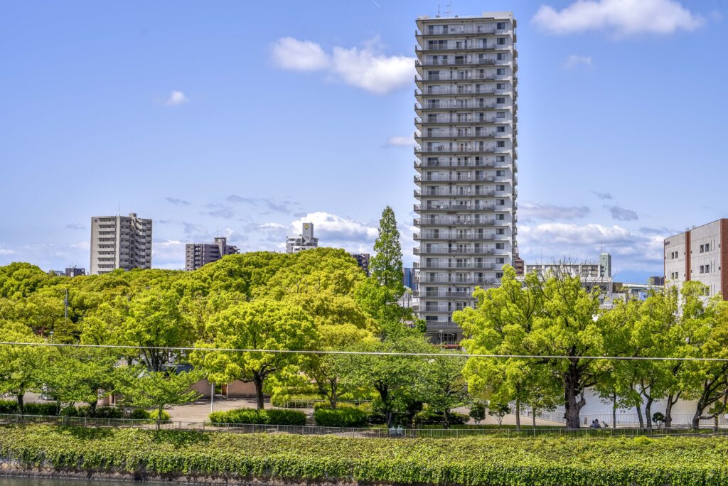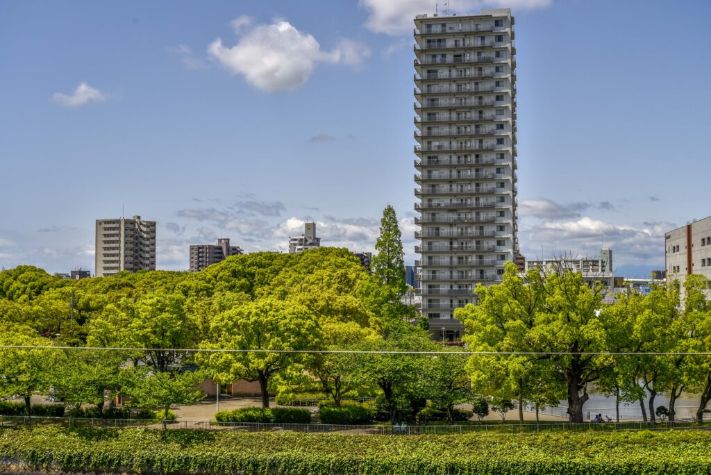 ピントは高層アパートの中程のバルコニーに合わせました。