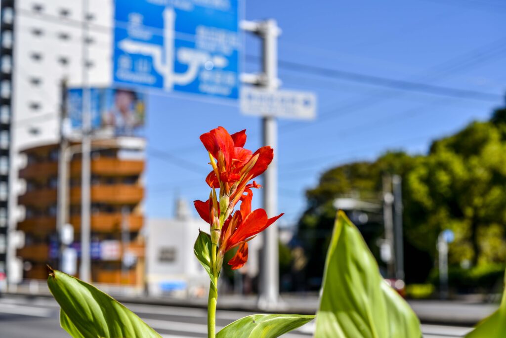 ピントは、高層ビルの隣の二色ビルに合わせました。