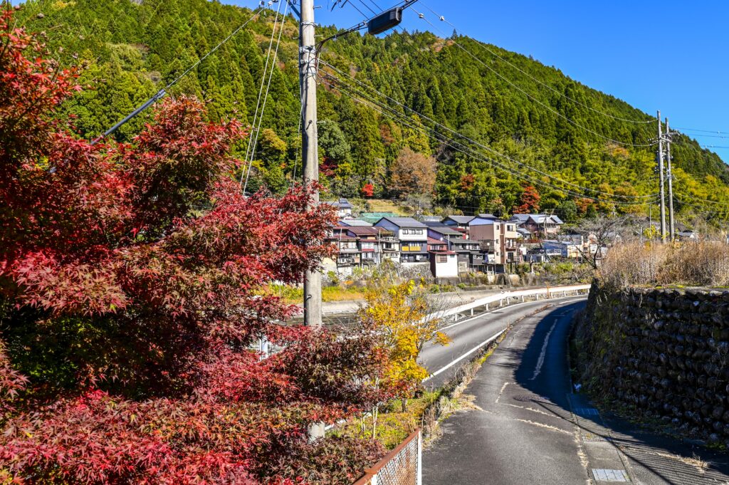 5分ほど歩くと、紅葉に染まった綺麗な山と、その前を流れる川が見えてきました。