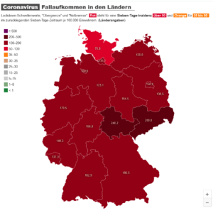すでに今、北のシュレスビヒーホルシュタイン州以外では、感染率はすでに100を超え、東では200超え。