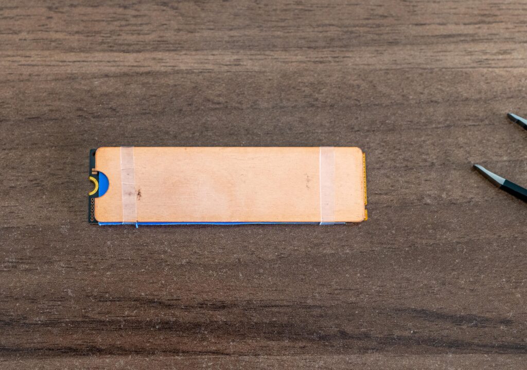 装填する前に、熱伝導緩衝材を敷いて、銅板を同封のプラスチックの輪ゴムで止めます。