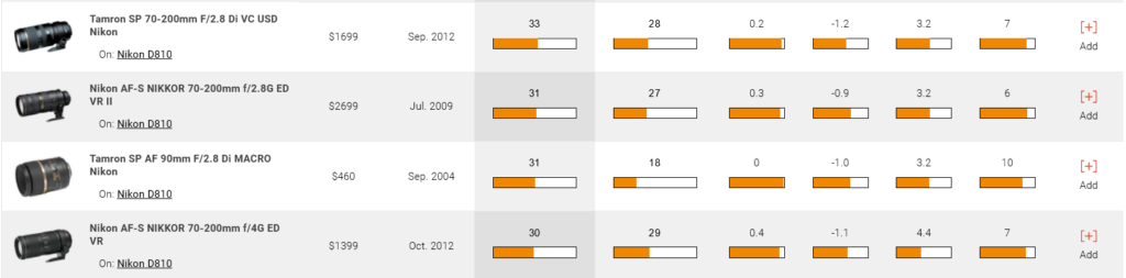 DXOによると、Nikon AF-S NIKKOR 70-200mm f4G ED VRが、タムロンよりわずかにシャープ!