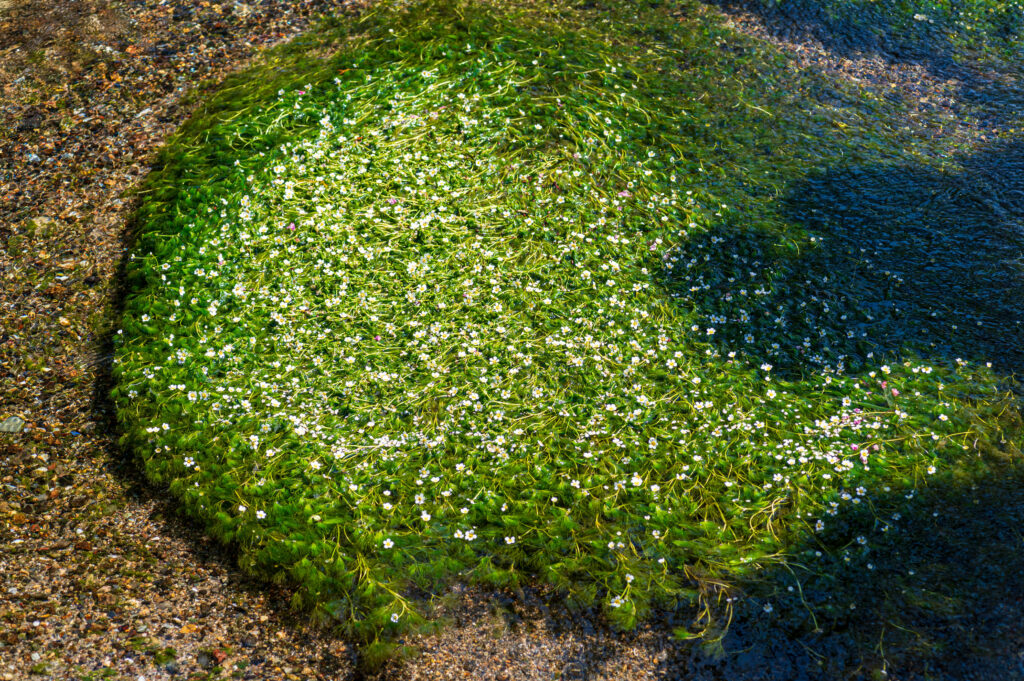 その冷たい水を好むのが梅花藻。