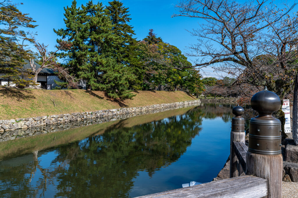 最初に見えてくるのはお堀。