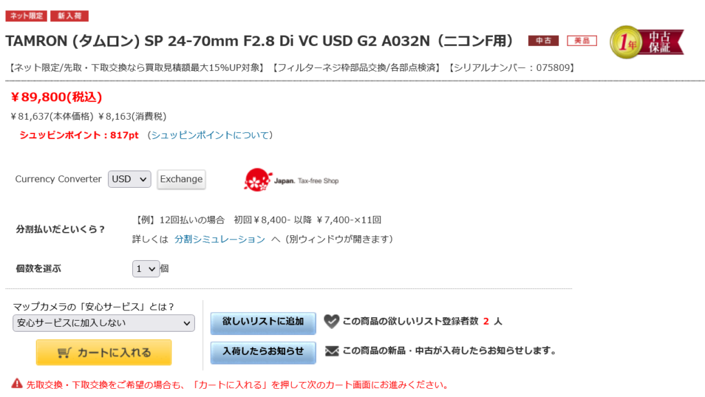 と書かれたタムロンの24-70mmが、ほぼ9万円。
