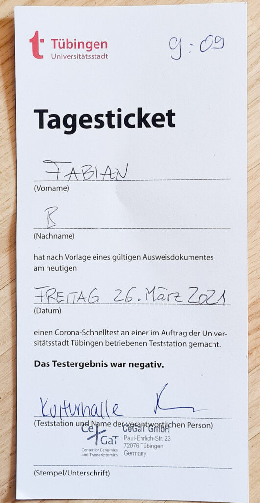 この即席コロナテストを受けれる会場を、テュービンゲン市内に設け住民 & 観光客に実施する。(*2)