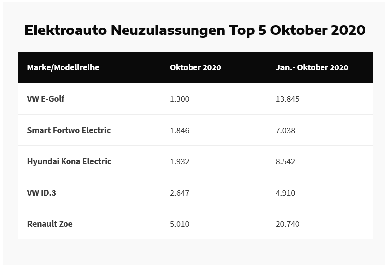 2020年10月の自動車販売台数が発表されると、販売台数の8.4%が電気自動車だった。これはこれまでの最高記録で、トップ5は韓国の現代自動車を除けば、電気自動車攻勢をかけている欧州の自動車メーカーが独占した。